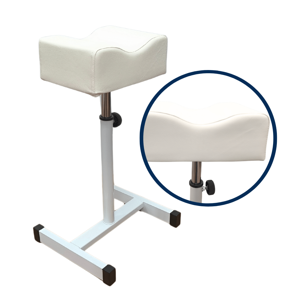 Fehér műbőr pedikűrös lábtartó, állítható magasságú, nyereg formájú lábtartó párna résszel.